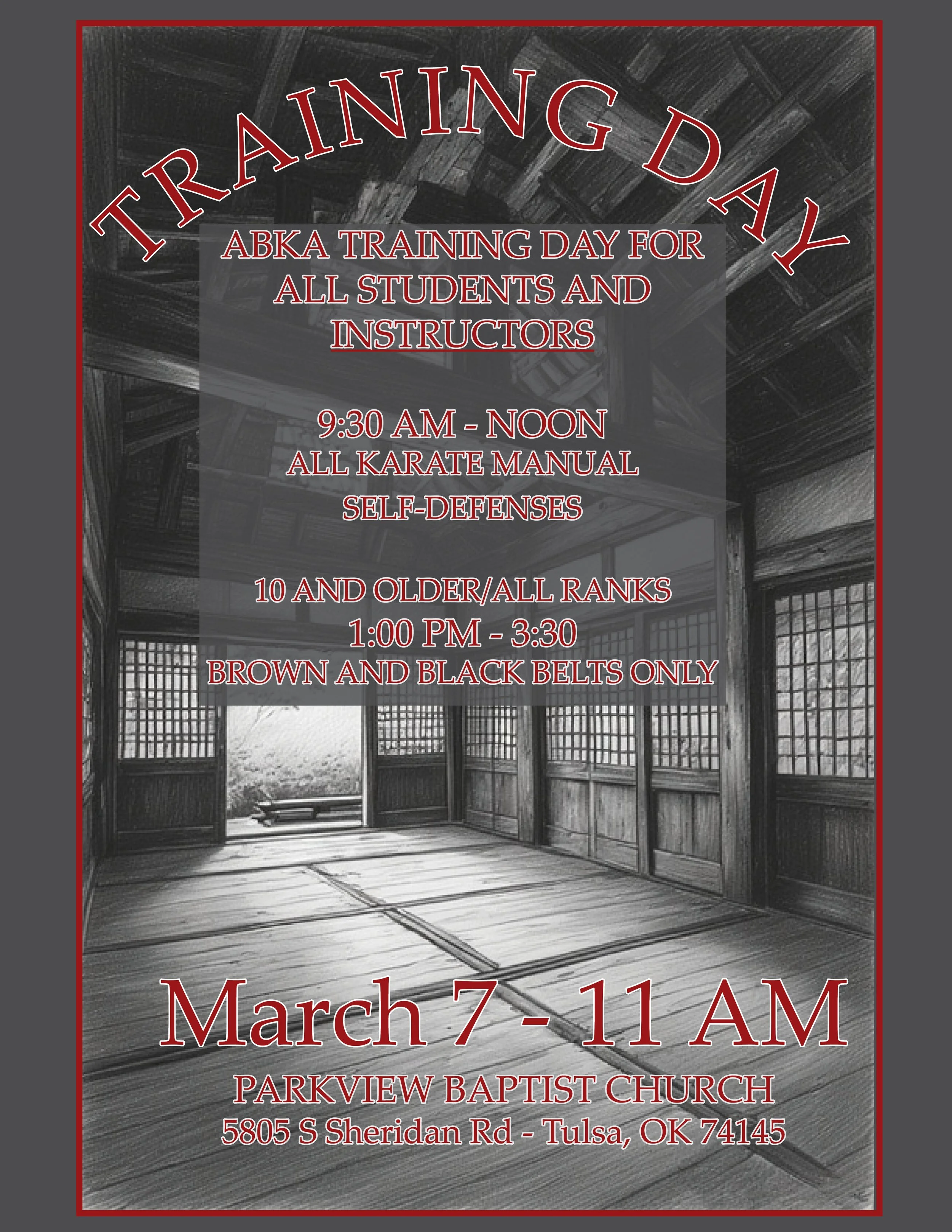 Black Belt test at the Armory Dojo (Parkview Baptist Church) at 58th and Sheridan in Tulsa at 10:00 a.m.